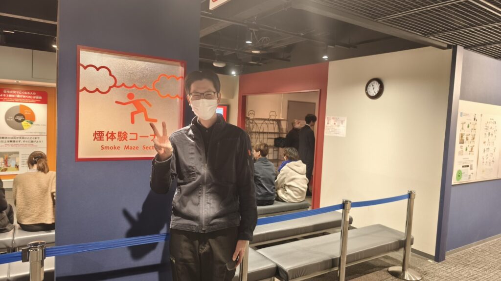 煙体験コーナーでは、煙が充満した空間での正しい避難方法を教わりました。 非常灯を頼りに姿勢を低くして進むのですが、視界がほとんどない真っ暗な中での避難は想像以上に難しく、実際の災害時の大変さを強く実感しました。
