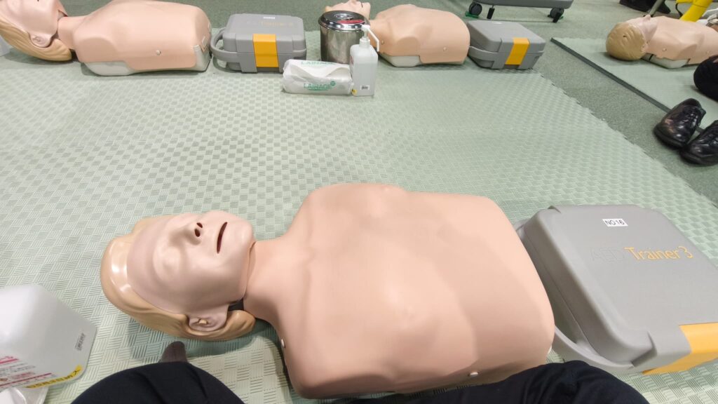 AEDの使用方法や心臓マッサージの手順についてもレクチャーを受けました。 実際に心臓マッサージを行ってみると、想像以上に体力を使う作業であり、一人で続けるのは非常に大変だと実感しました。緊急時には複数人で協力することの重要性を強く感じました。