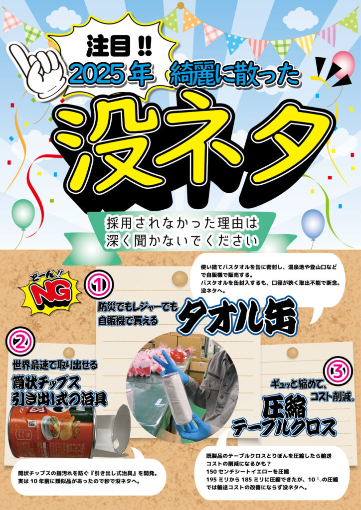 使い捨てバスタオルを缶に密封し、温泉地や登山口、防災用途として自動販売機で販売できないか、というアイデア。「いざという時に、すぐ買える」という発想は良かったものの、バスタオルを缶に封入すると口径が狭く、取り出せないという致命的な問題が発生。構造の壁を越えられず、今回は没ネタとなりました。