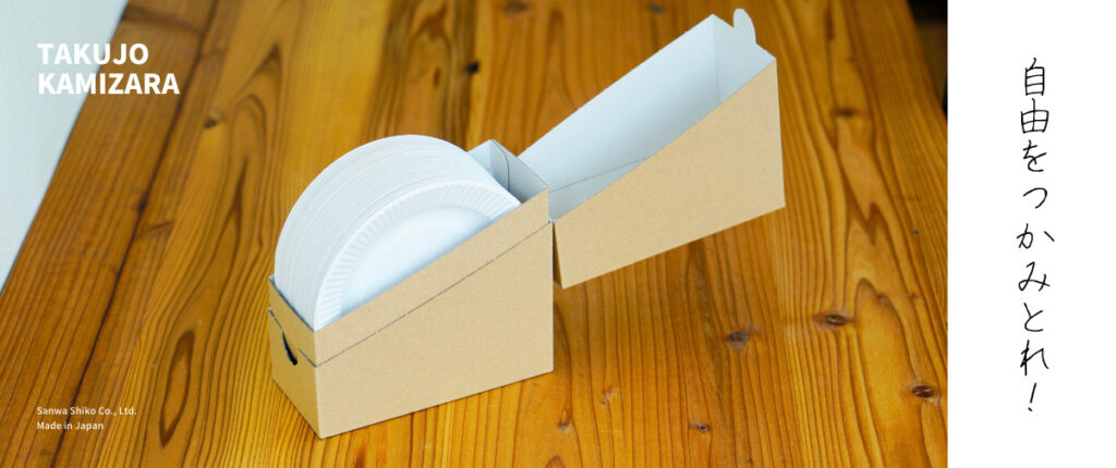 三和紙工が開発した卓上紙皿は、一見するとおしゃれなボックス。でも中には、使い勝手抜群の紙皿が詰まっています。